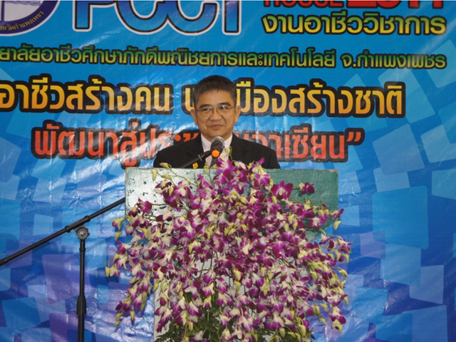 “อาชีววิชาการ อาชีวะสร้างคน พลเมืองสร้างชาติ พัฒนาสู่ประชาคมอาเซียน” โดยมีวัตถุประสงค์เพื่อให้ผู้ปกครองและผู้เรียนเห็นความสำคัญของการเรียนสายวิชาชีพ ที่จะทำให้มีอาชีพที่มั่นคง มีความพร้อมในการแข่งขัน และมีรายได้ที่สูงขึ้นในอนาคตเป็นไปตามนโยบายของกระทรวงศึกษาธิการ ในการเพิ่มสัดส่วนผู้เรียนสายอาชีวศึกษาให้มากขึ้น ในงานได้รับเกียรติจาก นายสมวุฒิ ศรีอำไพ ผู้อำนวยการสำนักงานเขตพื้นที่การศึกษาประถมศึกษากำแพงเพชร เขต 1 เป็นประธานในพิธีเปิด ซึ่งมีการจัดกิจกรรมที่หลากหลาย เช่น การจัดนิทรรศการของแผนกสาขาต่างๆ การนำเสนอผลงานของนักศึกษา การมอบทุนเรียนดี“ทุนเพชรภักดี”ให้แก่นักเรียนที่มีผลการเรียนดีได้ศึกษาต่อสายอาชีวศึกษา เป็นต้น มีโรงเรียนในสังกัด สพท.กำแพงเพชร เขต 1 นำนักเรียนเข้าร่วมกิจกรรมมากมาย ดร.พิทักษ์ มหบุญพาชัย ผู้อำนวยการ/ผู้รับใบอนุญาตวิทยาลัยอาชีวศึกษาภักดีพณิฃยการและเทคโนโลยี ได้กล่าวรายงานและกล่าวต้อนรับผู้มาร่วมงาน ได้ให้ความเห็นกับทีมงานข่าวว่า “....กระทรวง ศึกษาธิการ ได้มีนโยบายเพิ่มสัดส่วนผู้เรียนสายอาชีพ เป็น 49:51 ใน ปีการศึกษา 2557 เพื่อเตรียมกำลังคนเข้าสู่ประชาคมอาเซียน ในข้อเท็จจริงแล้ว ปีที่ผ่านมายังมีสัดส่วนของผู้เรียนสายอาชีพน้อยมาก วิทยาลัยเห็นความสำคัญดังกล่าวจึงจัดงานนี้ขึ้น โดยเฉพาะงานนี้ มีการลงนามข้อตกลงความร่วมมือการจัดการศึกษา ระบบทวิภาคี ระหว่างวิทยาลัยกับบริษัทเอเชียแปซิฟิคเครื่องจักรกลการเกษตร จำกัด มีการจัดทุนการศึกษาให้แก่นักเรียนในโรงเรียนเครือข่ายที่มีผลการเรียนดี เข้ารับ“ทุนเพชรภักดี” ซึ่งเป็นทุนการเรียนระดับปวช.ที่มีค่าใช้จ่ายต่ำมาก ผู้เรียนที่ได้รับทุนจะเสียค่าใช้จ่ายเพียงภาคเรียนละ 500 กว่าบาทเท่านั้น ค่าใช้จ่ายอื่นๆทุกอย่างวิทยาลัยออกให้หมดจนจบการศึกษาแบบไม่มีข้อผูกพันใดๆทั้งสิ้น. งานดังกล่าวจึงเป็นแนวทางการรณรงค์เพิ่มสัดส่วนผู้เรียนอาชีพอีกทางหนึ่งตามนโยบายของกระทรวงศึกษาธิการ.”ดร.พิทักษ์กล่าวในที่สุด .../