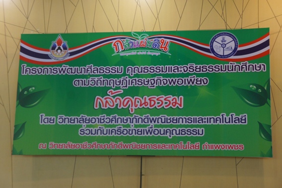 ระดับปวช.ชั้นปีที่ 1 ประจำปีการศึกษา 2557 โดยมีวัตถุประสงค์เพื่อปรับพฤติกรรมการใช้มทักษะชีวิต และการพัฒนาศีลธรรม คุณธรรมและจริยธรรมให้แก่นักศึกษาใหม่ตามวิถีทฤษฎีเศรษฐกิจพอเพียง ประจำปีการศึกษา 2557 ตามหลักสูตร “กล้าคุณธรรม” ของเครือข่ายเพื่อนฯคุณธรรม ดั้มอบหมายให้คณะวิทยากรสงฆ์จากเครือข่ายเพื่อนฯคุณธรรม โดยมี พระครูสมุห์เอกรัฐ อภิรักโข ประธานเครือข่ายเพื่อนฯคุณธรรม และพระอดุลย์ สีลสังวโร รองประธานเครือข่ายฯ พร้อมด้วยทีมงานพระสงฆ์ และชมรมต้นกล้าชากังราว เป็นคณะผู้ดำเนินการฝึกอบรม ได้รับเกียรติจากดร.พิทักษ์ มหบุญพาชัย เป็นประธานเปิดค่ายฝึกอบรมและมีดร.ธิติ มหบุญพาชัย เป็นประธานพิธีบายศรีสู่ขวัญและวันปิดค่ายฝึกอบรม ดำเนินการระหว่างวันที่ 15-16 พฤษภาคม 2557 ที่ผ่านมา ณ หอประชุมบุญพาชัย มีนักศึกษารใหม่ระดับชั้น ปวช.1 และปวส.1 เข้าร่วมกิจกรรมในครั้งนี้ จำนวนกว่า 150 คน